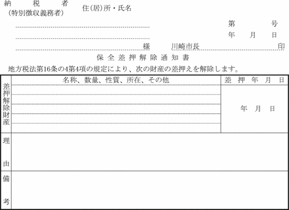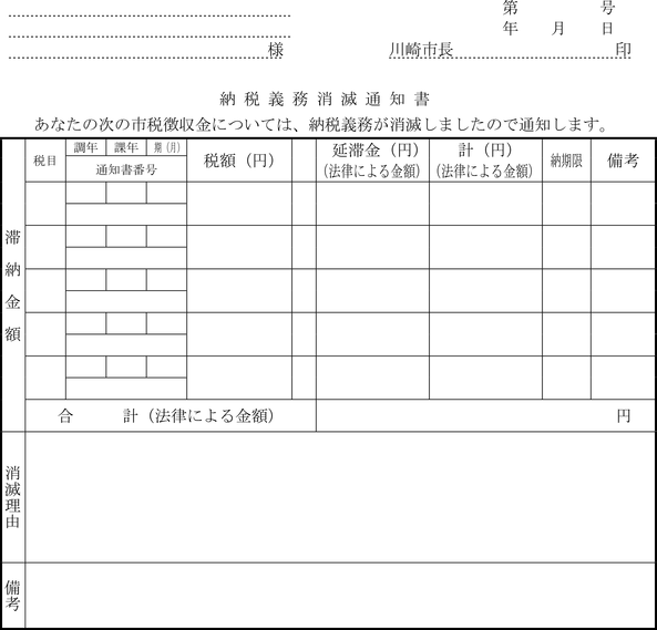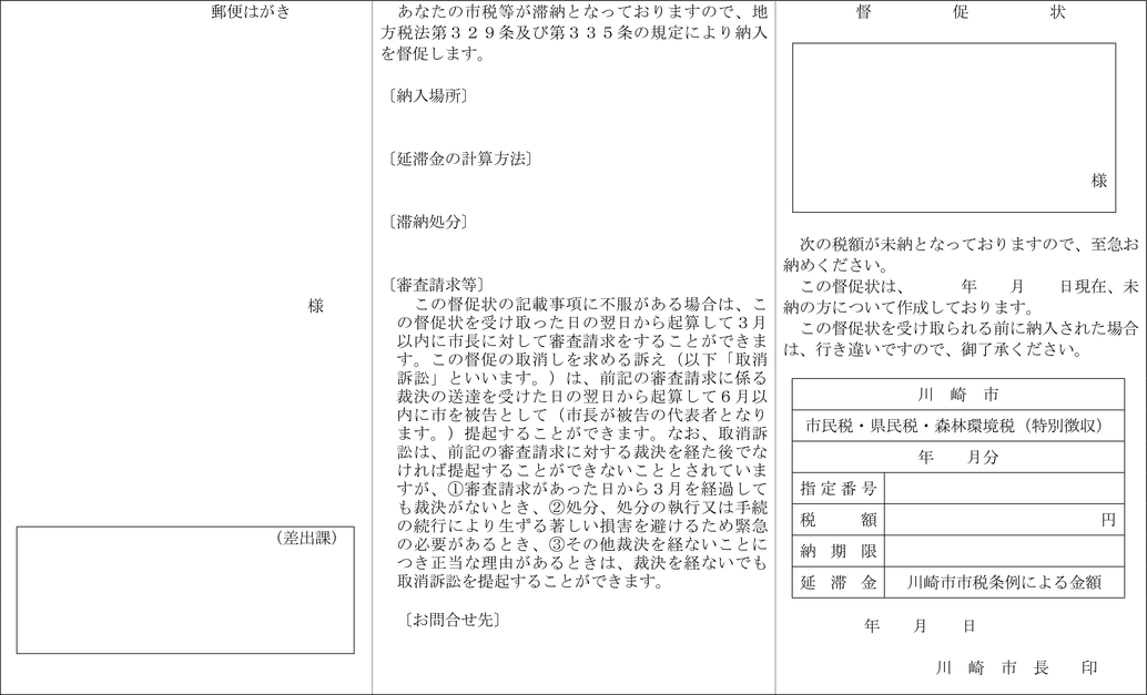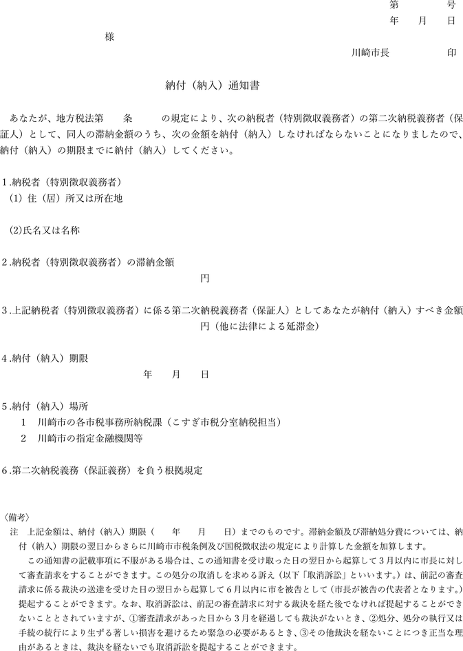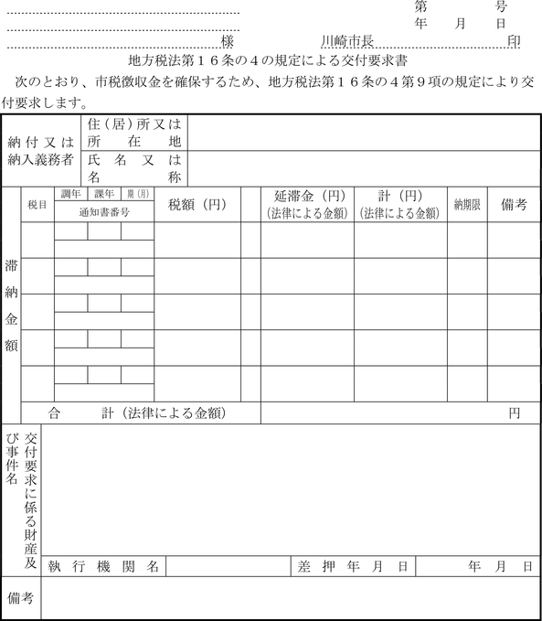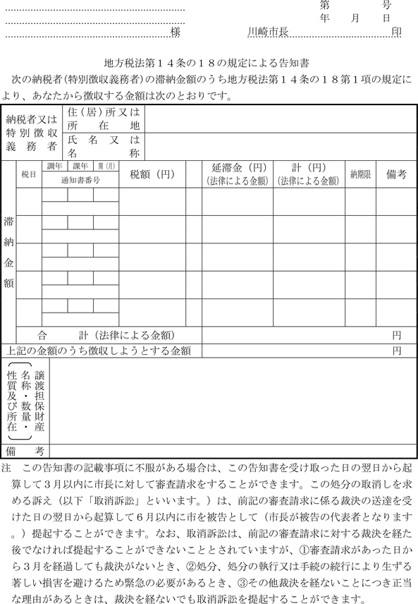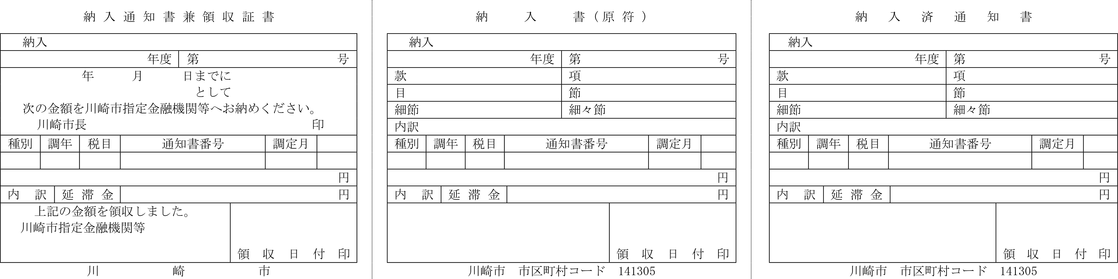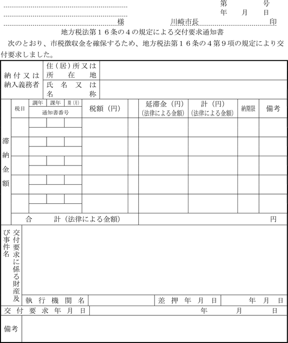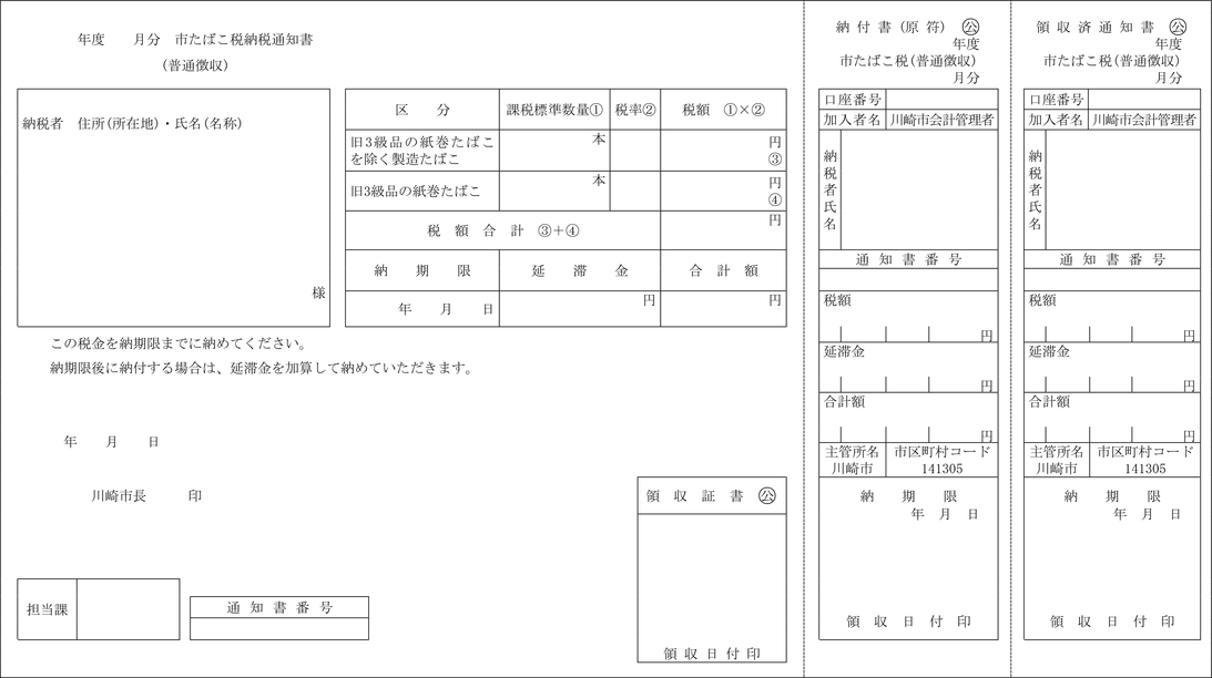 第4条 普通徴収の方法により徴収する市税に係る延滞金額の納付については、納入通知書又は納付書に代え、滞納税金の納税通知書にこれを併記して納付させることができる。