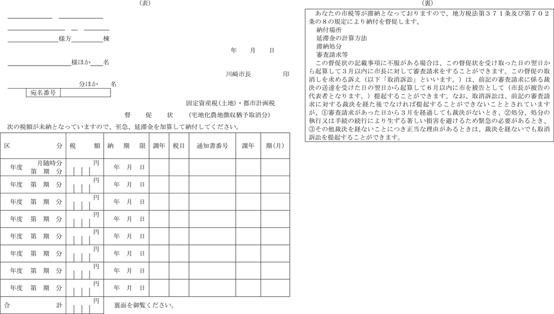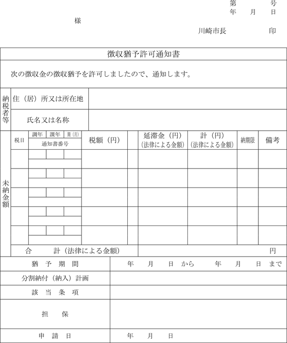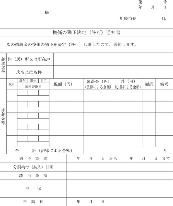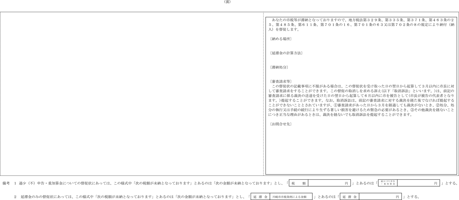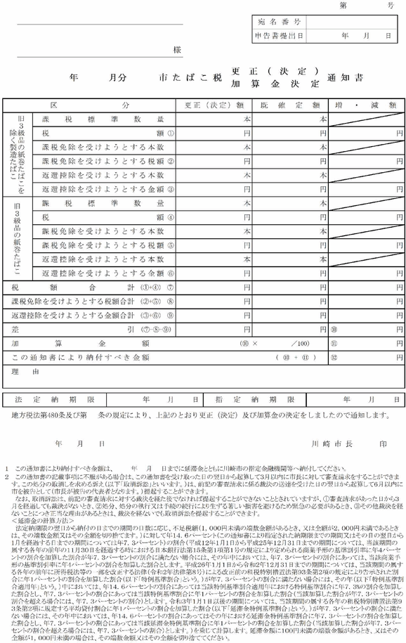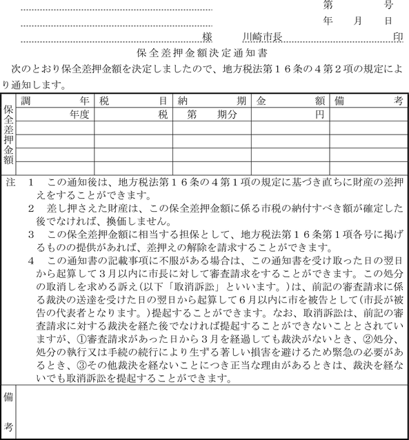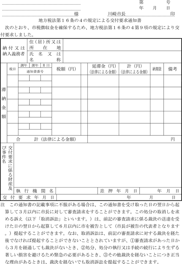 第4条 普通徴収の方法により徴収する市税に係る延滞金額の納付については、納入通知書又は納付書に代え、滞納税金の納税通知書にこれを併記して納付させることができる。