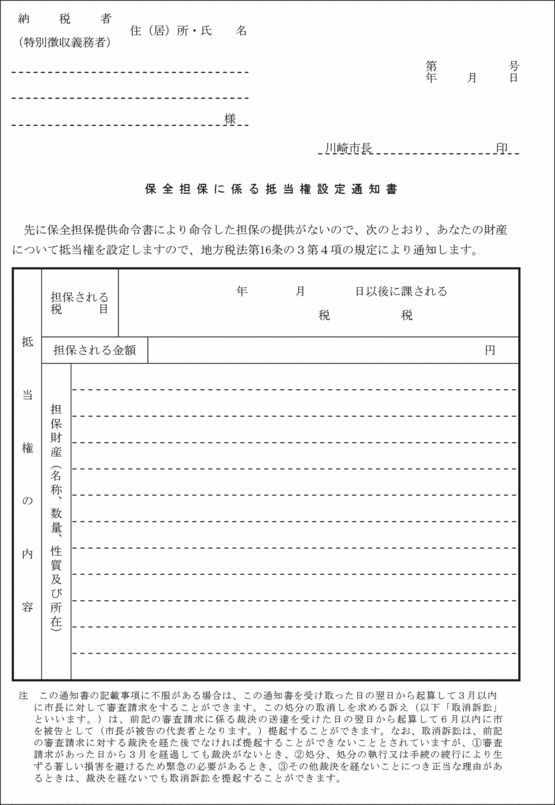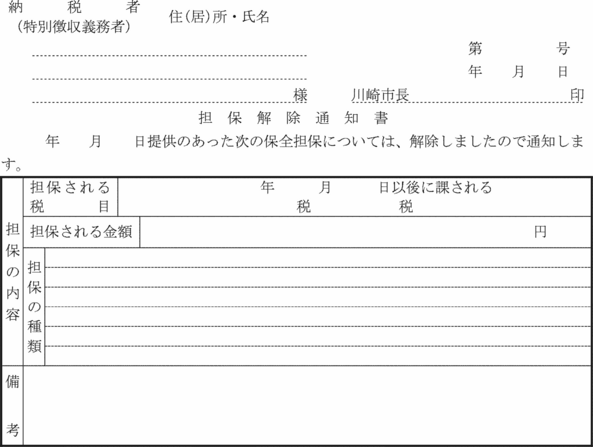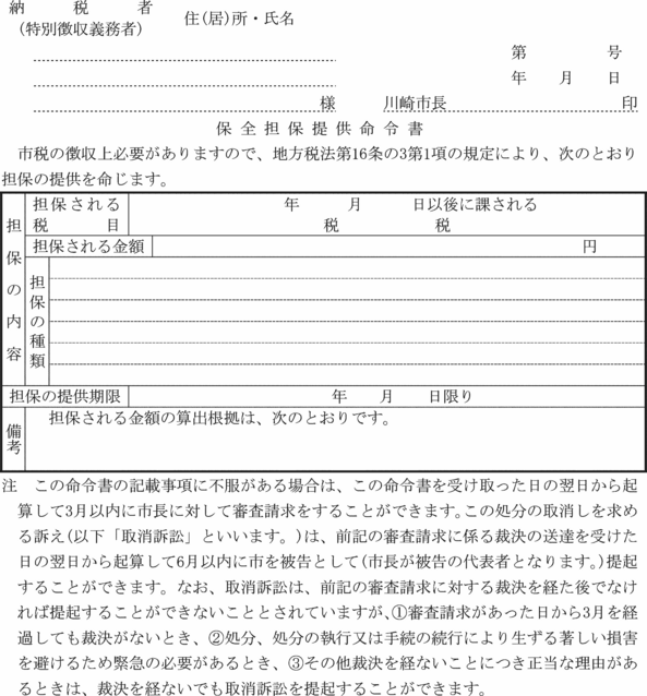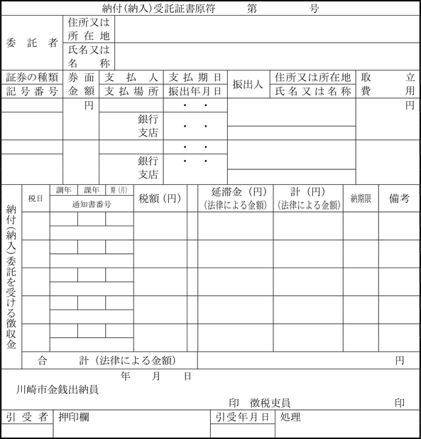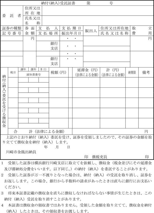 第2条の2 法第16条の2の規定により市長が定める有価証券とは、川崎市金銭会計規則(昭和39年川崎市規則第31号)第72条に定められた小切手以外の有価証券でその券面金額が納付又は納入委託(以下「納付委託」という。)の目的である徴収金の金額を超えない小切手、約束手形及び為替手形で次に掲げるものに限る。
