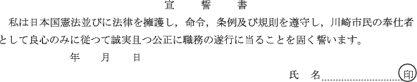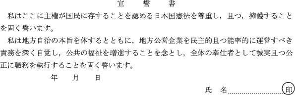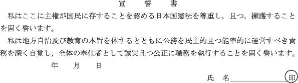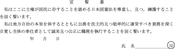 第2条 新たに職員となった者は、任命権者又は任命権者の定める上級の公務員の前で、別記様式による宣誓書に署名してからでなければその職務を行ってはならない。