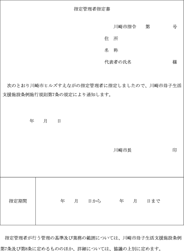第7条 市長は、条例第6条第1項の指定をしたときは、指定された法人等に対し、指定管理者指定書(別記様式)により通知する。