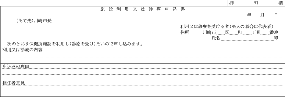 第1条 保健所施設の利用又は診察を受けようとする者は、別記第1号様式の申込書を保健所長に提出しなければならない。