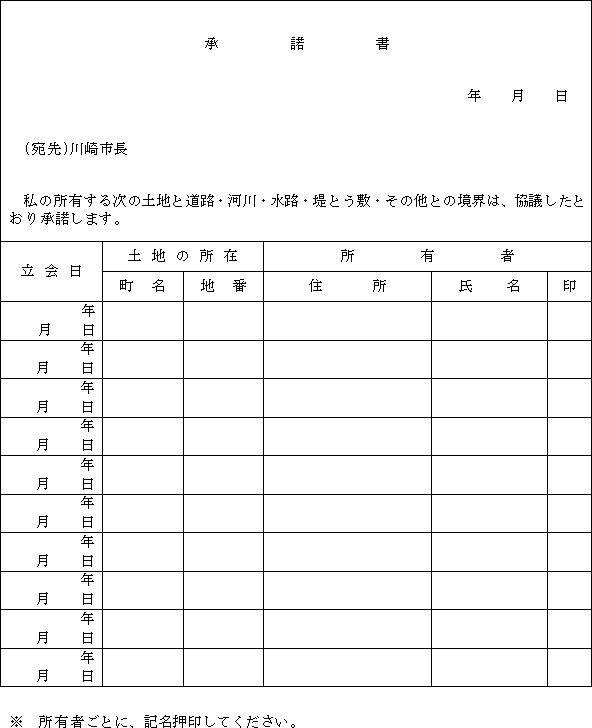 第7条 市長は、前条第1項の規定による協議又は同条第2項の承諾により境界確定が成立したときは、関係土地所有者から承諾書(第2号様式)の提出を受け、境界線上必要な箇所に境界標を設置するものとする。