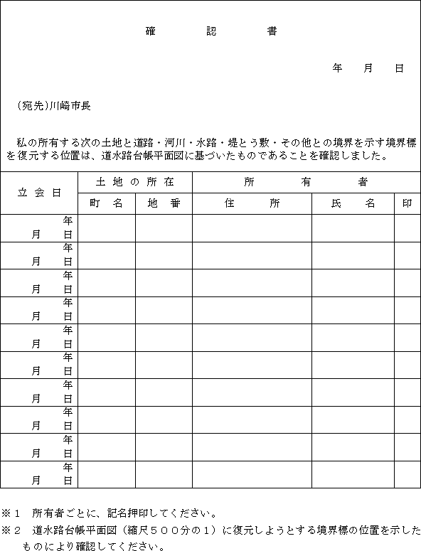 2 申請者は、第11条第1項の規定により境界標地先土地所有者に通知した場合にあっては、当該境界標地先土地所有者から前条第1項又は第2項の規定による確認を受けた後、確認書(第3号様式)の交付を受け、これを前項の図面と併せて市長に提出するものとする。