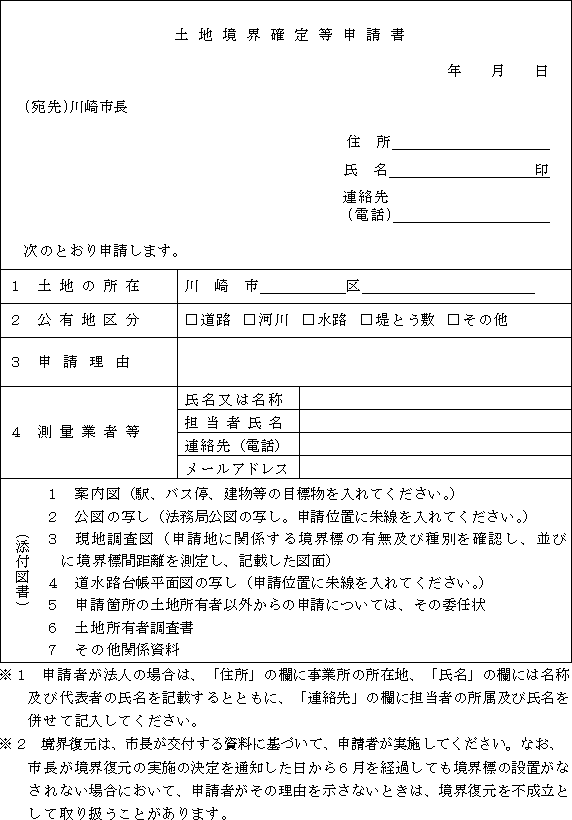 第3条 境界確定又は境界復元を申請しようとする者は、土地境界確定等申請書(第1号様式)に公図の写しその他市長が必要と認める書類を添付して市長に提出しなければならない。