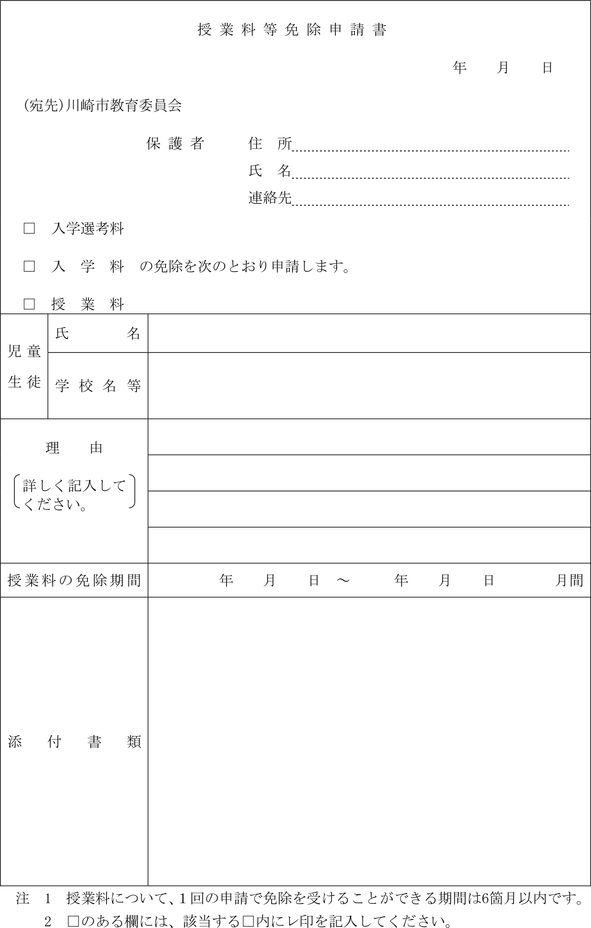 第4条 第8条の規定により入学選考料、入学料又は授業料(以下「授業料等」という。)の減免を受けようとする者は、授業料等免除申請書(第1号様式(1))又は授業料等減額申請書(第1号様式(2))に、申請の理由を証明する書類を添付し、校長を経て、教育委員会に提出しなければならない。この場合において、授業料の減免を受けようとする者は、高等学校等就学支援金の支給に関する法律第3条第2項各号のいずれかに該当する者でなければならない。
