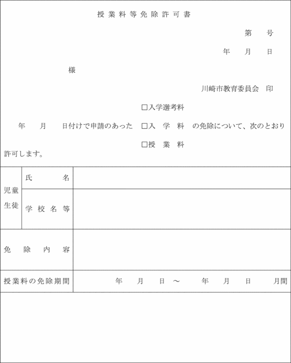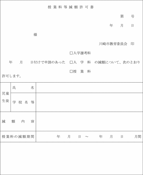第5条 教育委員会は、前条の申請書を受理したときは、その許否を決定し、許可の場合は、授業料等免除許可書(第2号様式(1))又は授業料等減額許可書(第2号様式(2))を、校長を経て、当該申請をした者に交付する。
