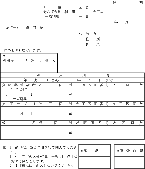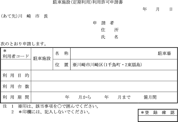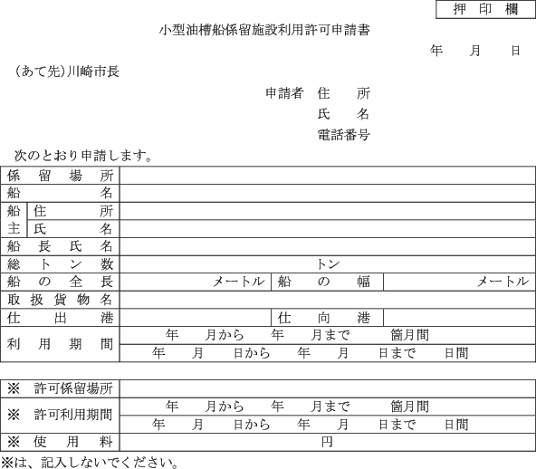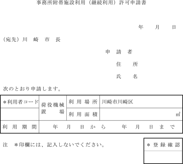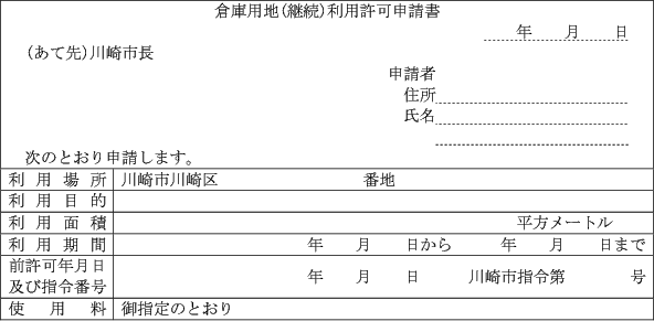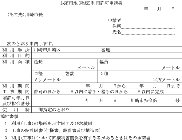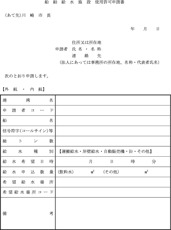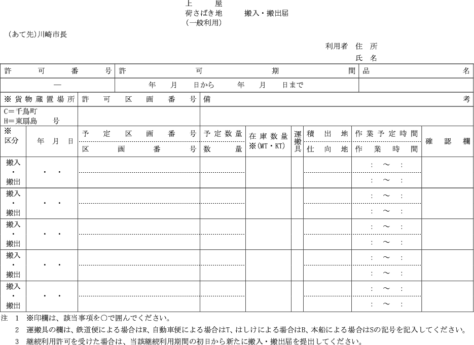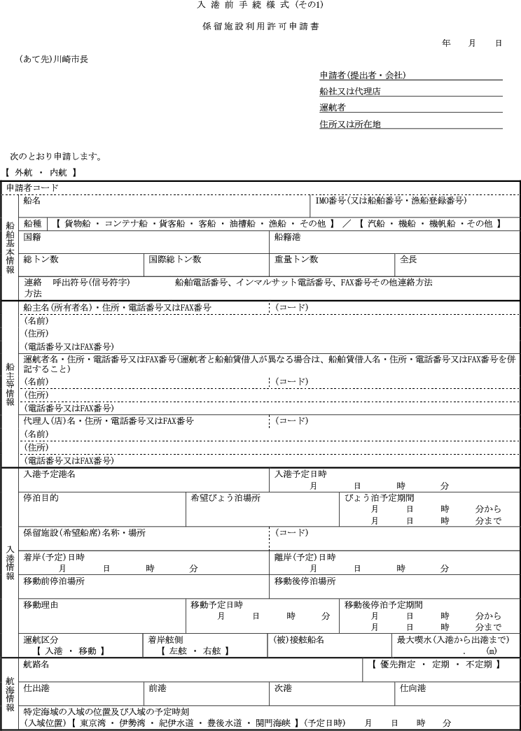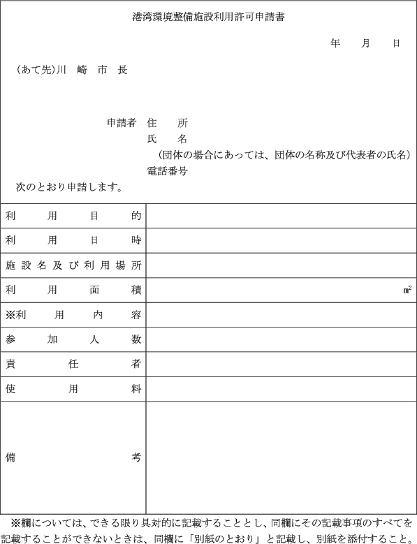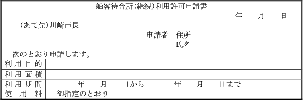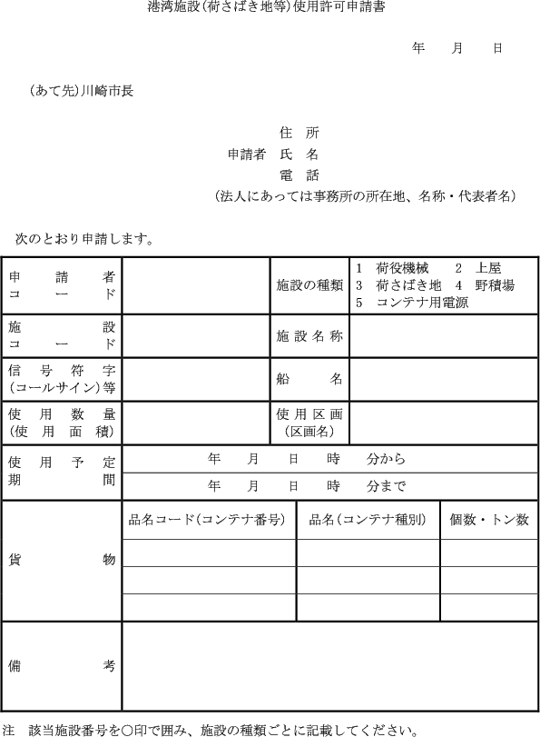 第1条の7 条例第3条第1項又は第2項の規定により港湾施設(指定管理者が管理を行うものを除く。)の利用許可を受けようとする者は、次に定める様式により市長に申請しなければならない。