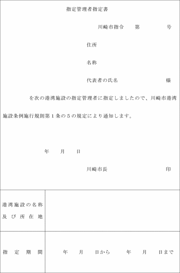 第1条の5 市長は、条例第2条の2第1項の指定をしたときは、指定された法人等に対し、指定管理者指定書(第1号様式)により通知する。