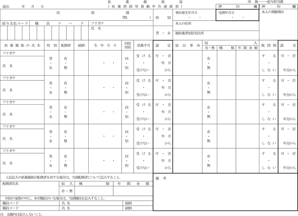 第11条 新たに職員となった者に扶養親族がある場合又は職員に次の各号のいずれかに掲げる事実が生じた場合においては、その職員は、直ちに、扶養親族届(