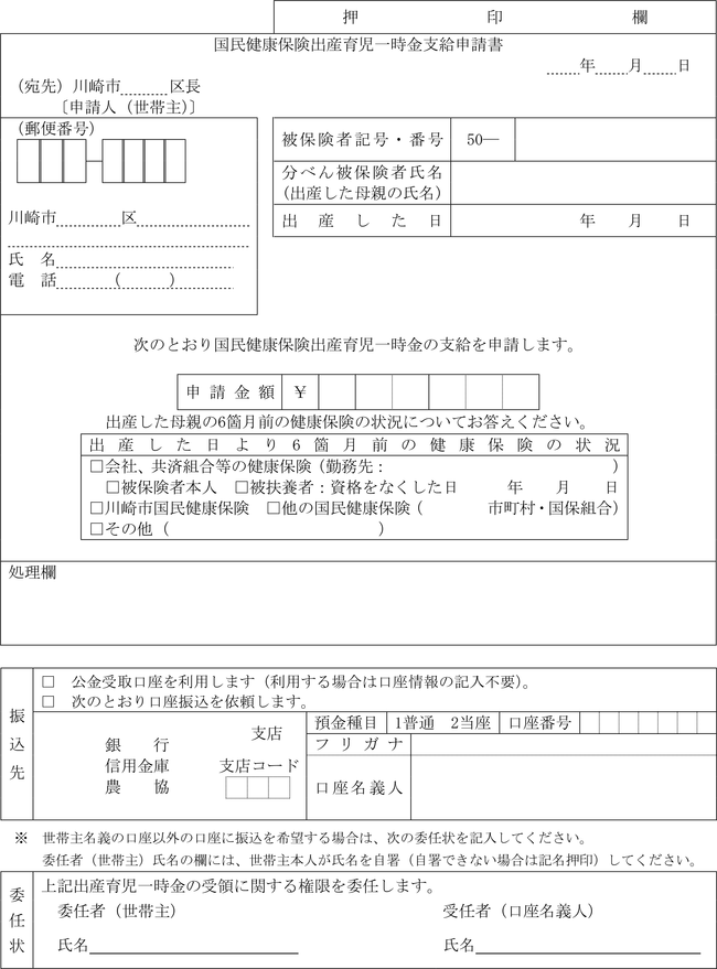 第5条 世帯主が条例第6条の規定により出産育児一時金の支給を受けようとするときは、出産育児一時金支給申請書に医師又は助産師の分べんの事実を証する書類を添えて区長に提出しなければならない。ただし、出生の届出があったと認められるときは、医師又は助産師の分べんの事実を証する書類を添えることを要しない。
