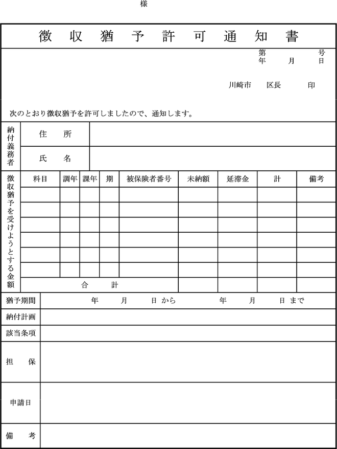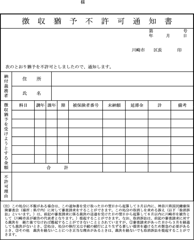 第14条 条例第38条第2項に規定する申請書の提出があったときは、区長はこれを審査し、その必要があると認めるときは徴収猶予許可通知書を、不適当と認めるときは徴収猶予不許可通知書を当該納付義務者に交付するものとする。