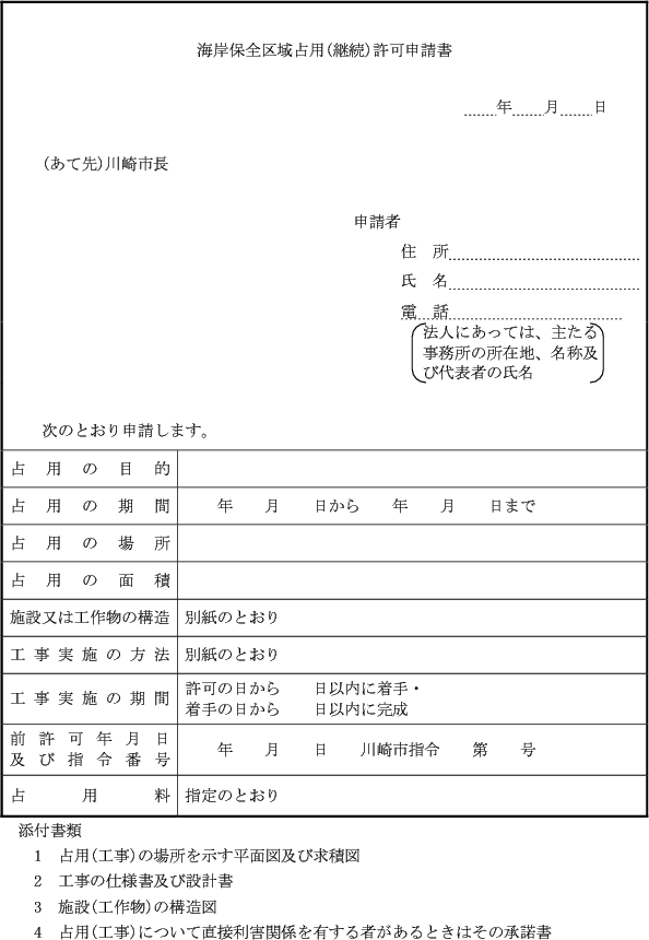 第2条 法第7条第1項の規定による占用の許可を受けようとする者は、海岸保全区域占用(継続)許可申請書(第1号様式)を市長に提出しなければならない。