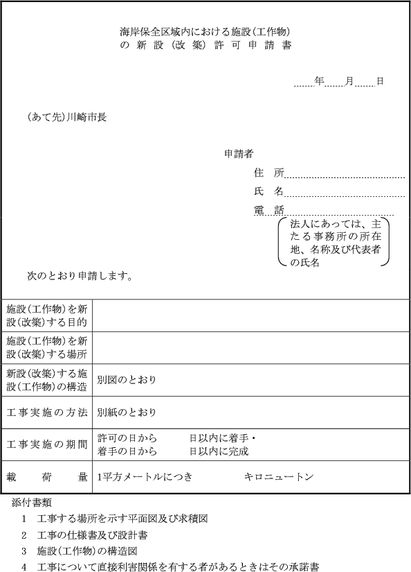 2 法第8条第1項の規定による同項第2号に掲げる行為の許可を受けようとする者は、海岸保全区域内における施設(工作物)の新設(改築)許可申請書(第2号様式)を市長に提出しなければならない。