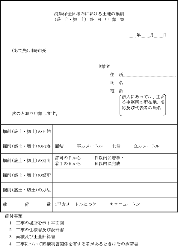 3 法第8条第1項の規定による同項第3号に掲げる行為の許可を受けようとする者は、海岸保全区域内における土地の掘削(盛土・切土)許可申請書(第3号様式)を市長に提出しなければならない。