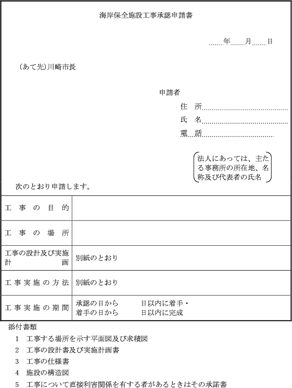 4 法第13条第1項の規定による工事の承認を受けようとする者は、海岸保全施設工事承認申請書(第4号様式)を市長に提出しなければならない。