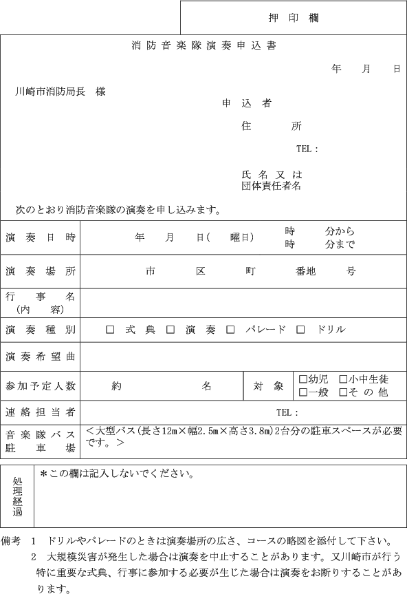 第12条 音楽隊の派遣を要請する者(以下「申込者」という。)には、消防音楽隊演奏申込書(第1号様式)により、派遣希望日の前月10日までに局長あてに提出させるものとする。ただし、局長が認める場合は、この限りでない。