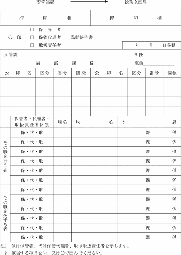 6 所管部局長は、保管者、保管代理者及び取扱責任者の異動のあったときは、速やかにその職氏名を公印保管者、保管代理者、取扱責任者異動報告書(第1号様式)により総務企画局長に報告しなければならない。