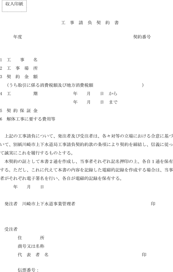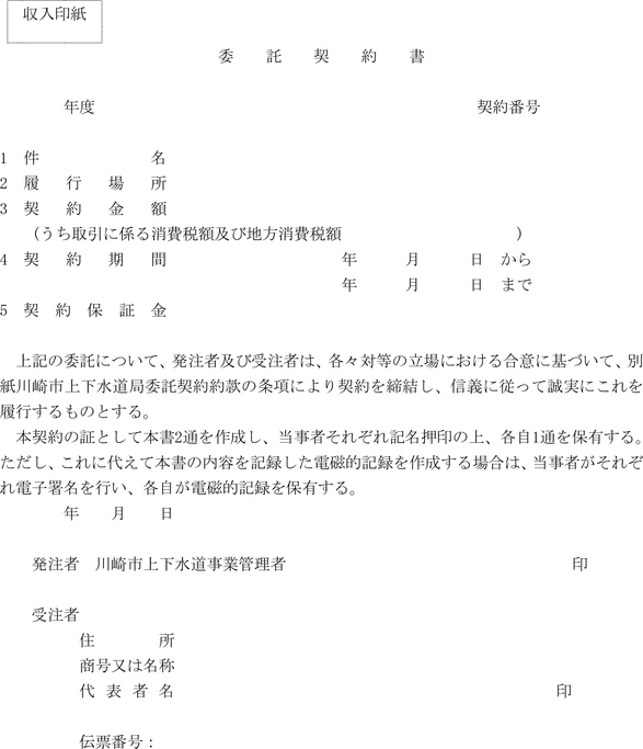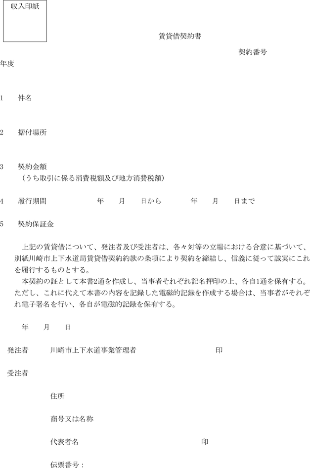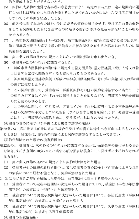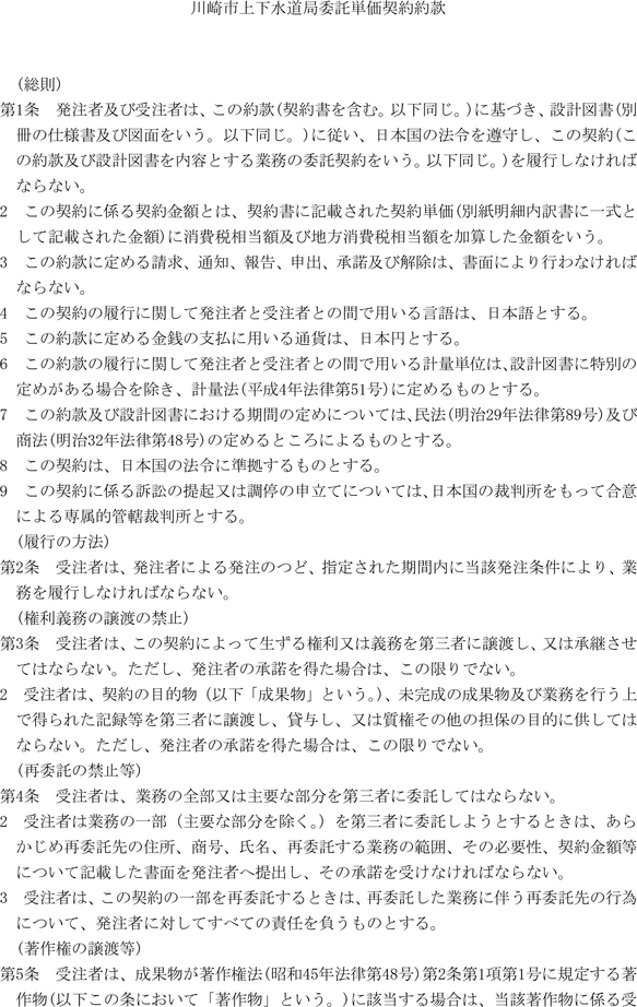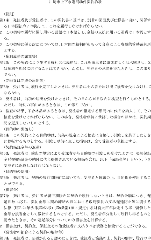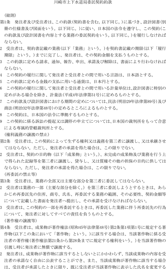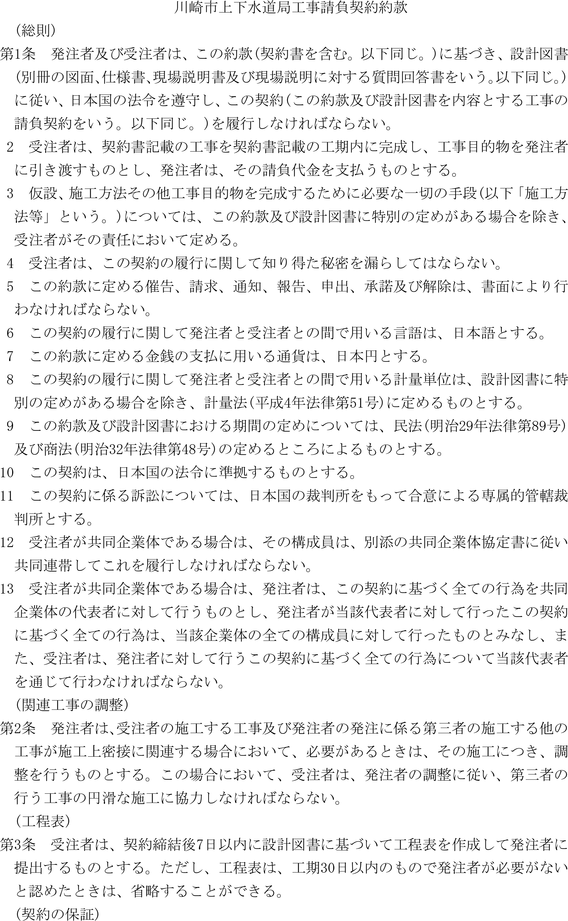 第1条 上下水道局(以下「局」という。)の売買、貸借、請負その他の契約に関し必要な事項は、法令、川崎市契約条例(昭和39年川崎市条例第14号。以下「条例」という。)又は他に特別の定めがあるもののほか、この規程の定めるところによる。