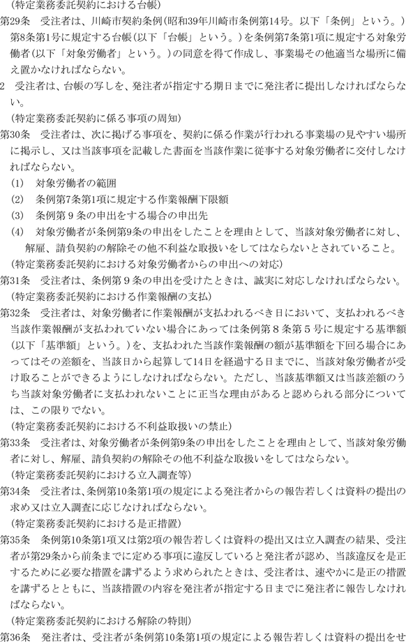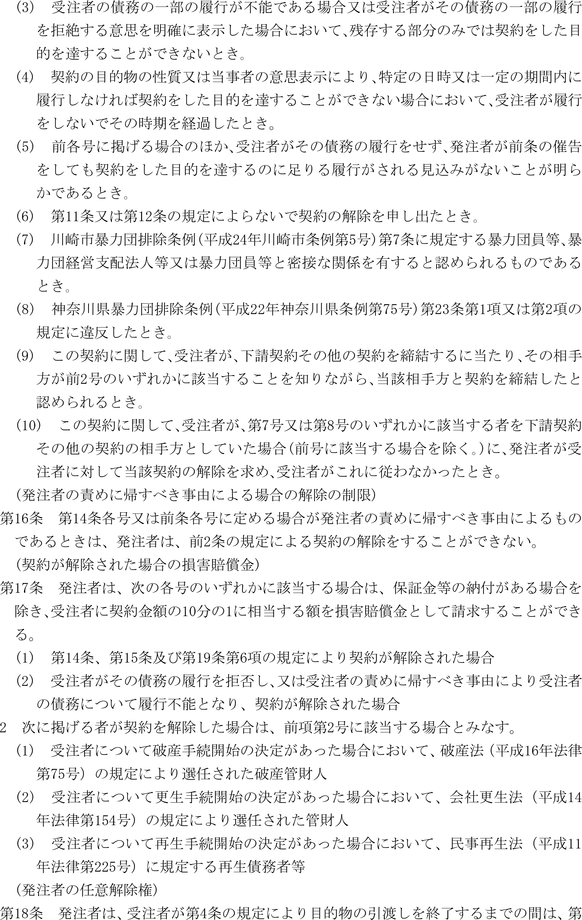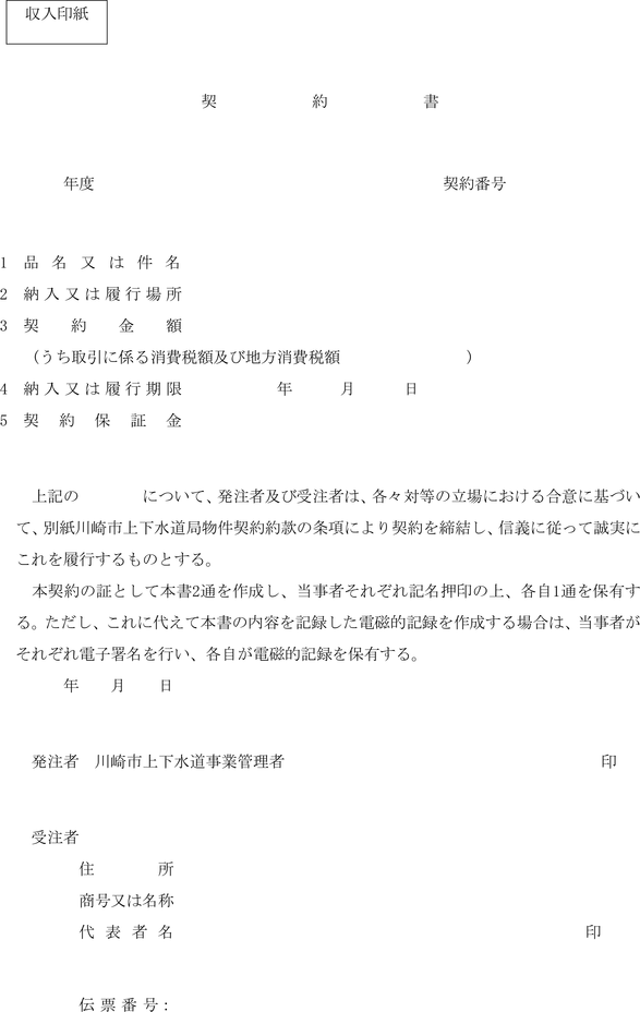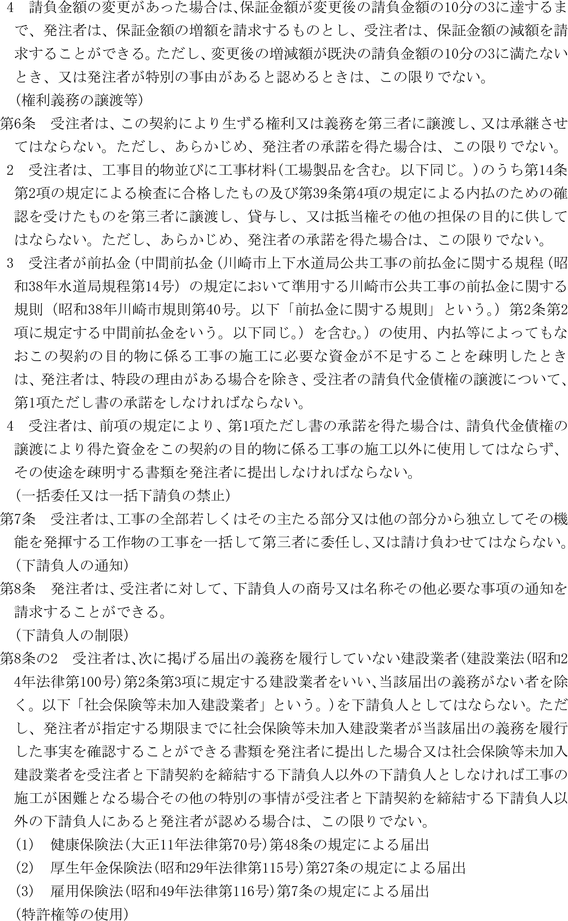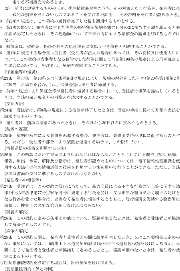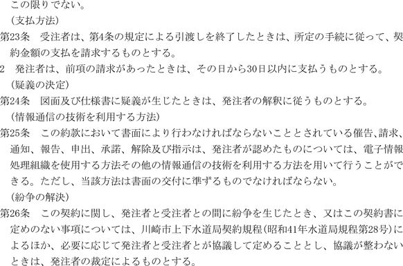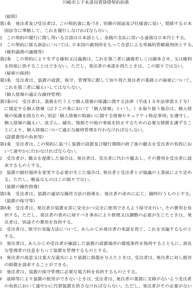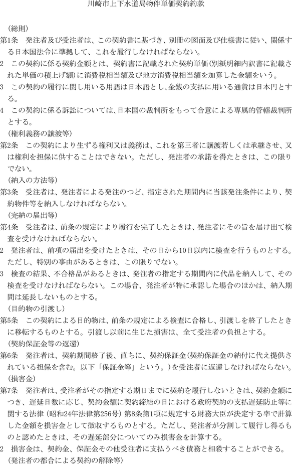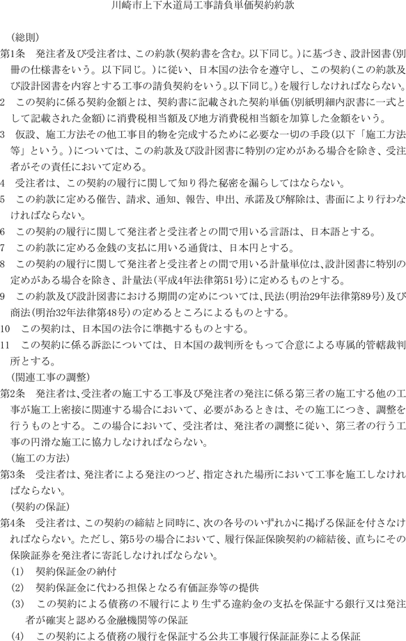 第1条 上下水道局(以下「局」という。)の売買、貸借、請負その他の契約に関し必要な事項は、法令、川崎市契約条例(昭和39年川崎市条例第14号。以下「条例」という。)又は他に特別の定めがあるもののほか、この規程の定めるところによる。