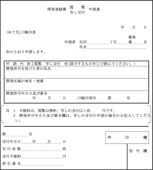 第6条 登録簿を閲覧し、又はその写しの交付を請求しようとする者は、開発登録簿閲覧写し交付申請書(別記様式)に必要事項を記載のうえ、市長の承認を受けなければならない。
