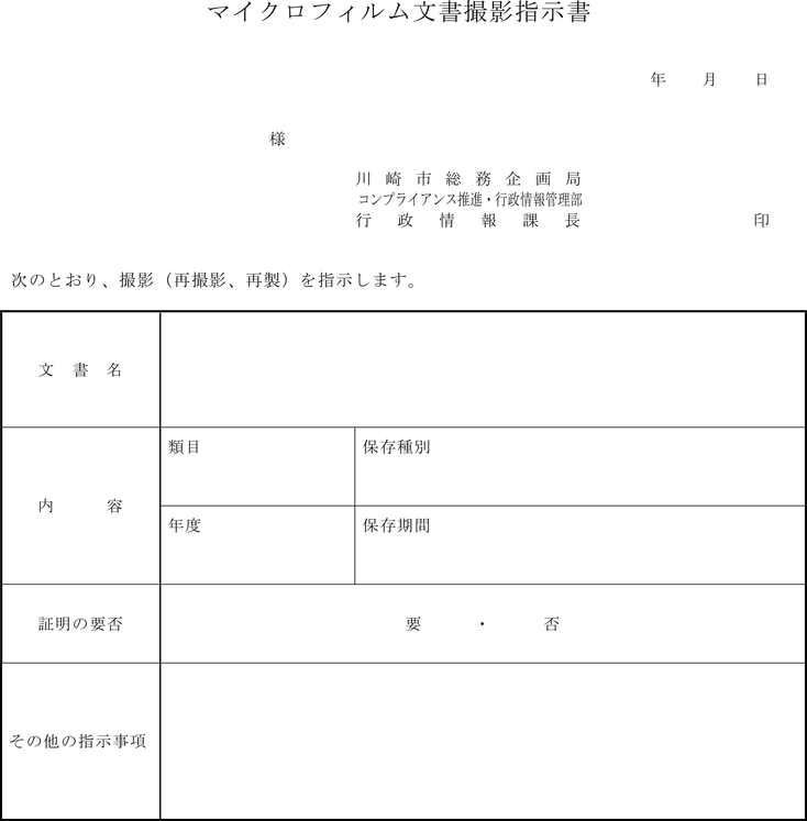 第4条 行政情報課長は、公文書をマイクロフィルムに撮影するときは、川崎市公文書管理規程(昭和36年川崎市訓令第2号。以下「公文書管理規程」という。)第39条の規定にかかわらず、公文書の引継ぎを受けることができる。