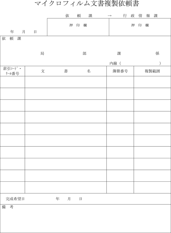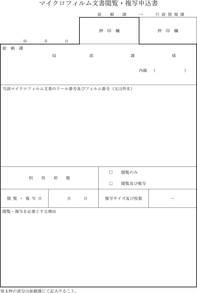 第10条 所管課長は、複製マイクロフィルム文書を必要とするときは、マイクロフィルム文書複製依頼書(第5号様式)により、行政情報課長に依頼しなければならない。