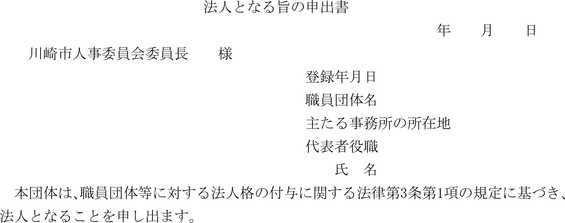 第7条 登録を受けた職員団体が、職員団体等に対する法人格の付与に関する法律(昭和53年法律第80号。以下「法」という。)第3条第1項の規定により法人となる旨の申出をしようとする場合は、法人となる旨の申出書(第6号様式)によるものとする。