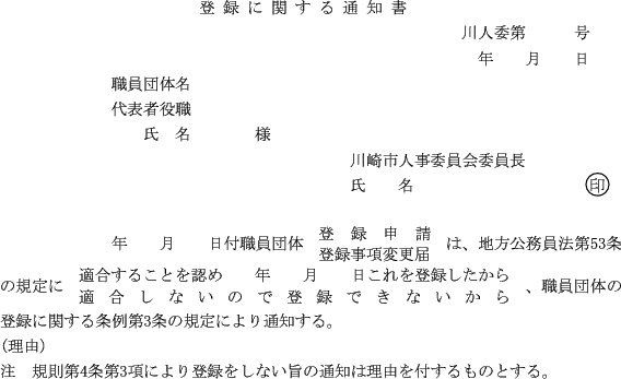 第1条 この規則は、職員団体の登録に関する条例(昭和41年川崎市条例第27号。以下「条例」という。)第6条の規定に基づき、職員団体の登録に関し、必要な事項を定めるものとする。