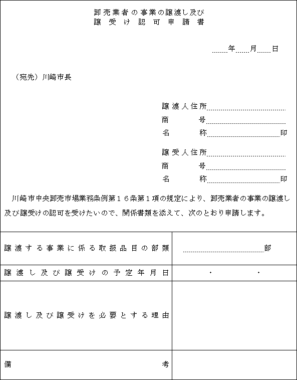 17 | 仲卸業者(関連事業者)の営業等の譲渡し及び譲受け認可申請書 | 第26条第1項 第40条第1項 |