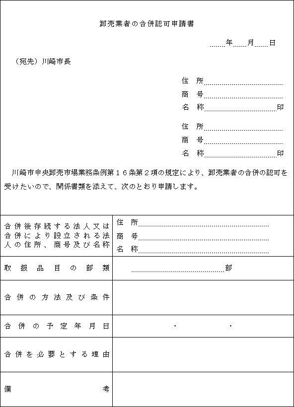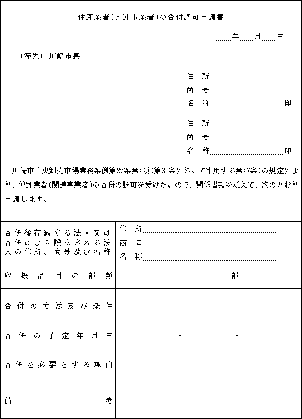 18 | 仲卸業者(関連事業者)の合併認可申請書 | 第26条第2項 第40条第2項 |