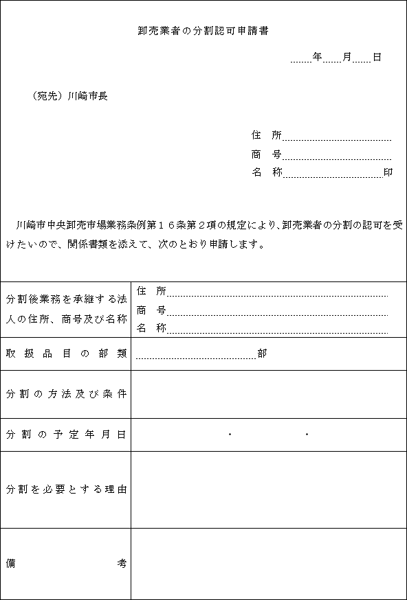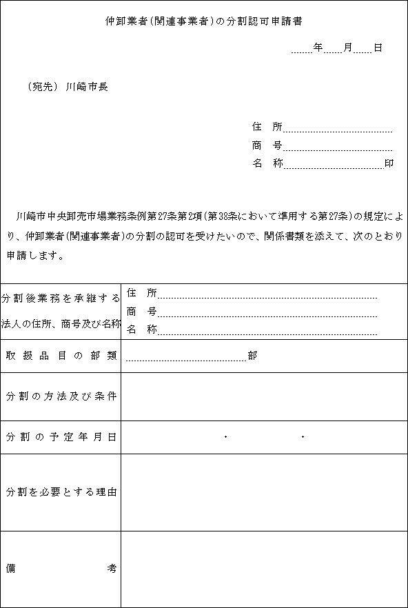 19 | 仲卸業者(関連事業者)の分割認可申請書 | 第26条第2項 第40条第2項 |