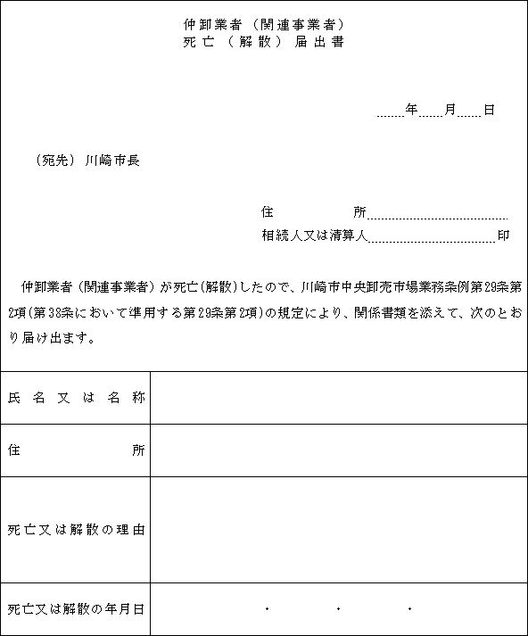 22 | 仲卸業者(関連事業者)死亡(解散)届出書 | 第29条第2項 第43条第2項 |