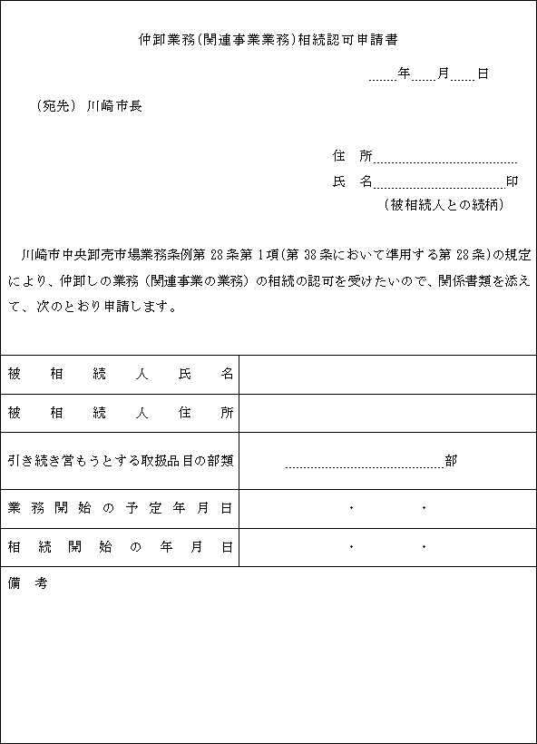 20 | 仲卸業務(関連事業業務)相続認可申請書 | 第27条第1項 第41条第1項 |