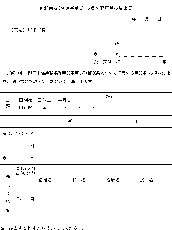 21 | 仲卸業者(関連事業者)名称変更等届出書 | 第29条第1項 第43条第1項 |