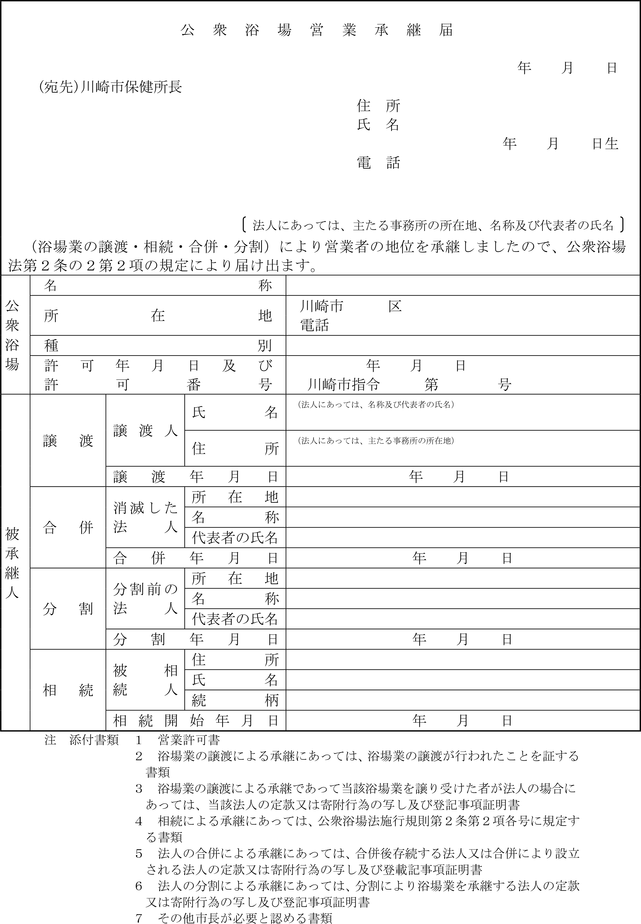 第5条 浴場業を営む者(以下「営業者」という。)の地位を承継した者が行う法第2条の2第2項の規定による営業者の地位の承継の届出は、公衆浴場営業承継届(第4号様式)により行うものとする。