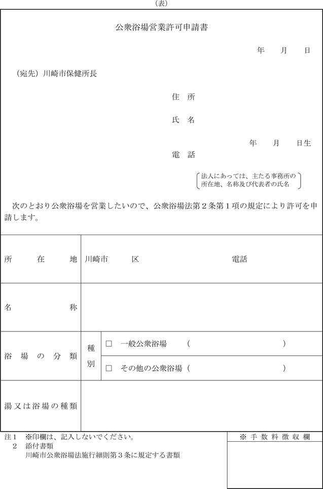 第2条 法第2条第1項の規定により、業として公衆浴場を経営しようとする者は、公衆浴場営業許可申請書(第1号様式)に次条に掲げる書類を添えて保健所長に申請しなければならない。