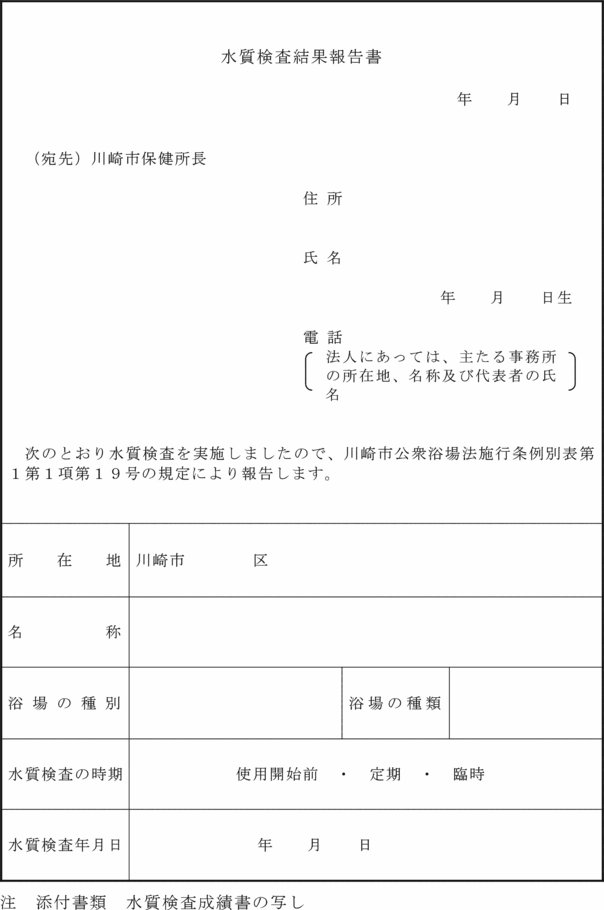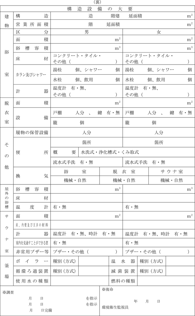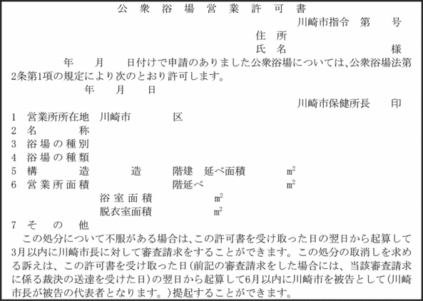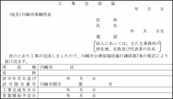 第7条 公衆浴場の建築工事に着手する前又はその工事が完成する前に営業の許可を受けた者は、工事が完成したときは、当該公衆浴場の使用開始前に工事完成届(第7号様式)を保健所長に提出し、当該公衆浴場の構造設備について環境衛生監視員の検査を受けなければならない。