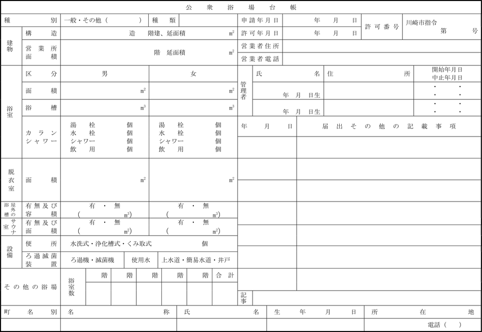 第1条 公衆浴場法(昭和23年法律第139号。以下「法」という。)の施行については、法、公衆浴場法施行規則(昭和23年厚生省令第27号)及び川崎市公衆浴場法施行条例(平成24年川崎市条例第64号。以下「条例」という。)に定めるもののほか、この細則の定めるところによる。