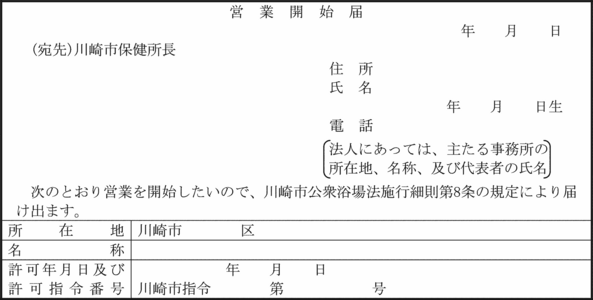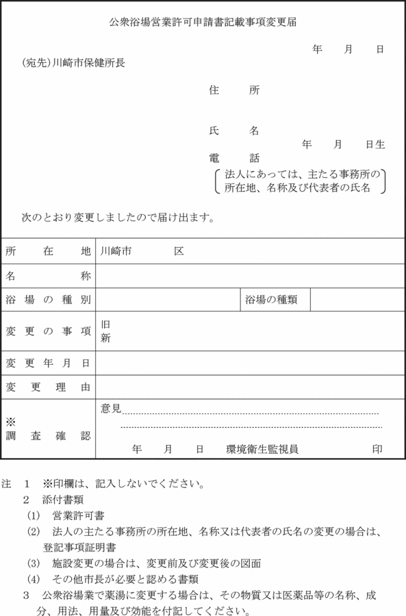 第6条 営業者は、第2条の規定による申請書の記載事項を変更したとき、又は営業の全部若しくは一部を停止し、若しくは廃止したときは、10日以内に公衆浴場営業許可申請書記載事項変更届(第5号様式)又は公衆浴場営業停止(廃止)届(第6号様式)を保健所長に提出しなければならない。