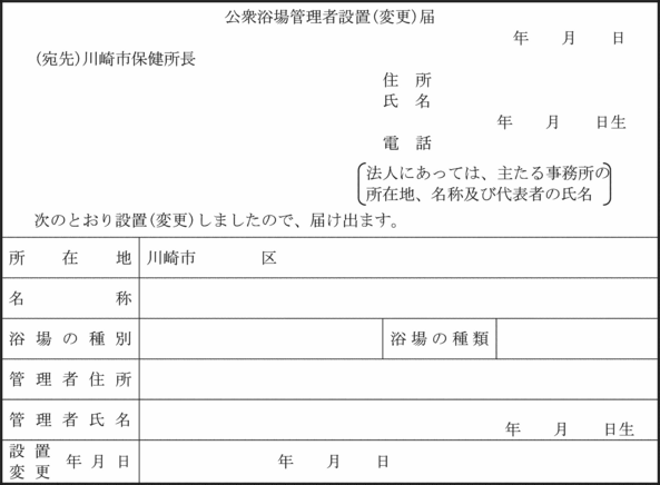 第12条 営業者は、新たに管理者を置いたとき、又は管理者を変更したときは、10日以内に公衆浴場管理者設置(変更)届(第10号様式)を保健所長に提出しなければならない。