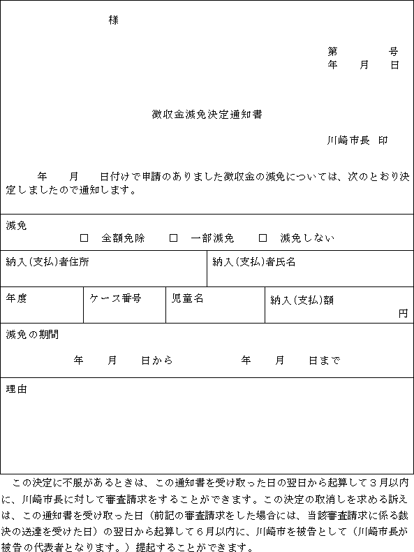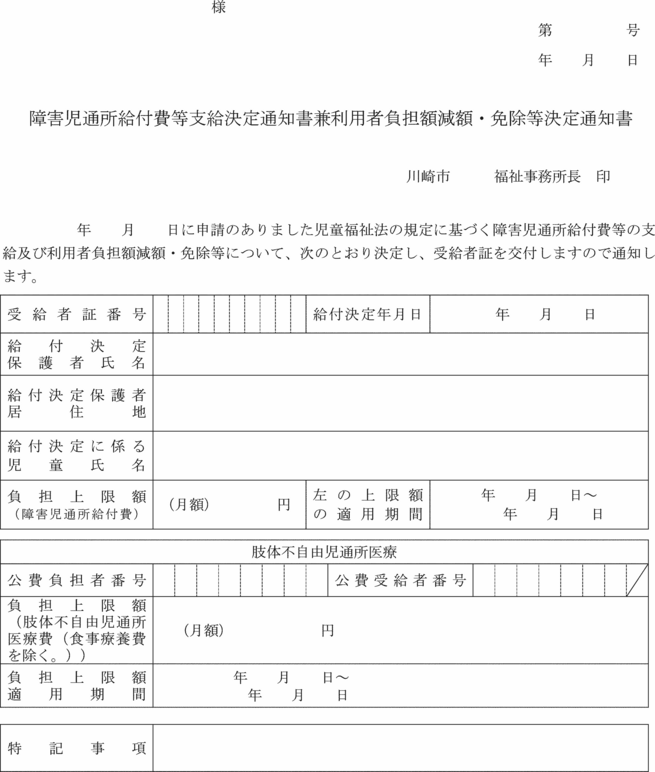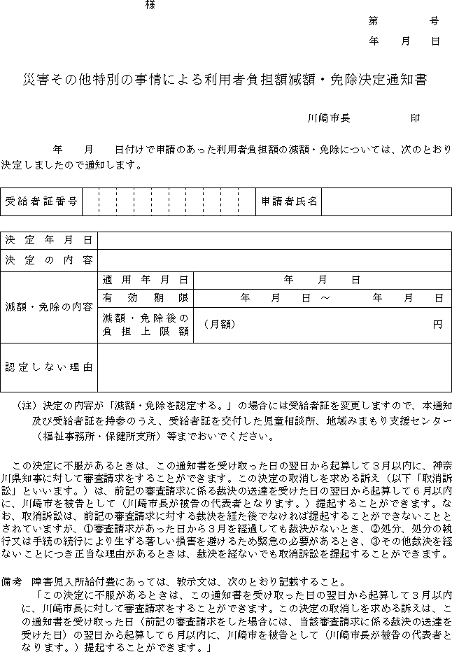 2 市長は、前項の障害児通所給付費等の額の特例の適用の可否を決定したときは、災害その他特別の事情による利用者負担額減額・免除決定通知書(第15号の9様式)により当該申請をした者に通知するものとする。