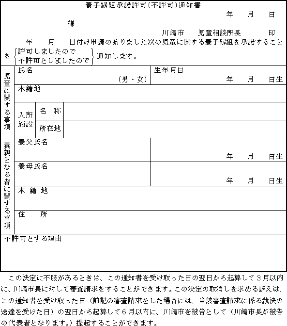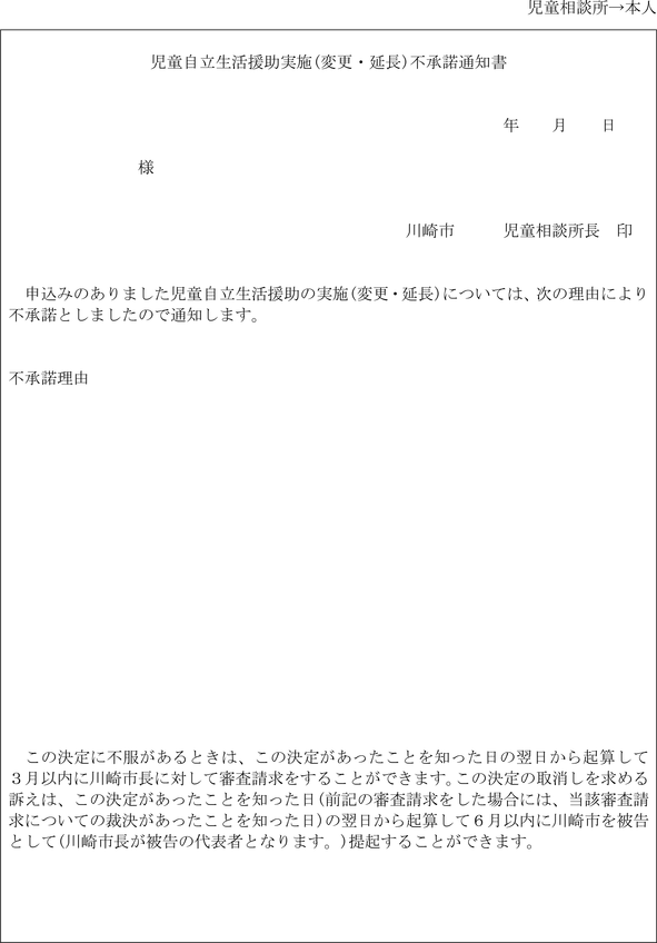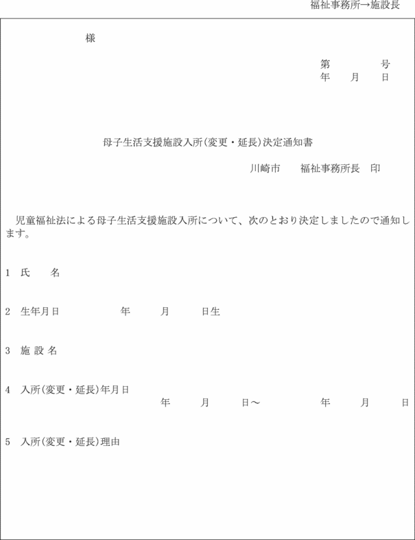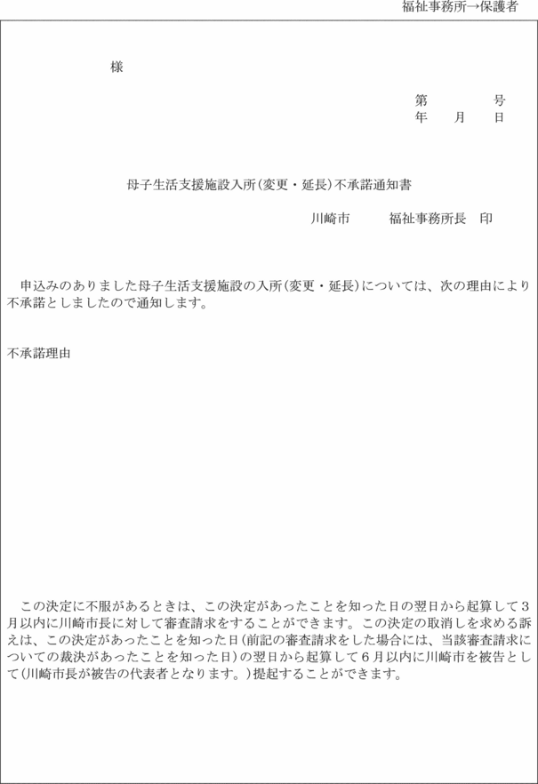 3 福祉事務所長は、法第23条第1項の規定による母子保護の実施又は母子保護の実施の変更を承諾するときは母子生活支援施設入所(変更・延長)決定通知書(第19号の4様式)により母子生活支援施設の長及び保護者に通知し、承諾しないときは母子生活支援施設入所(変更・延長)不承諾通知書(第19号の5様式)により保護者に通知しなければならない。