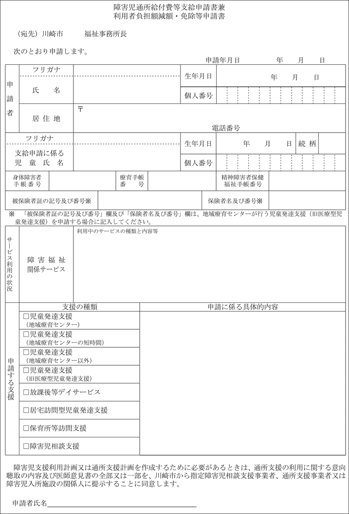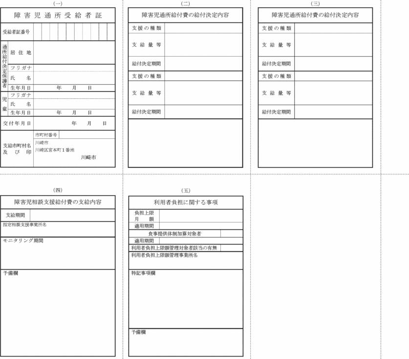 第5条 法第21条の5の6第1項の規定により通所給付決定の申請をしようとする者は、障害児通所給付費等支給申請書兼利用者負担額減額・免除等申請書(第10号様式)をその居住地を所管する福祉事務所長に提出しなければならない。