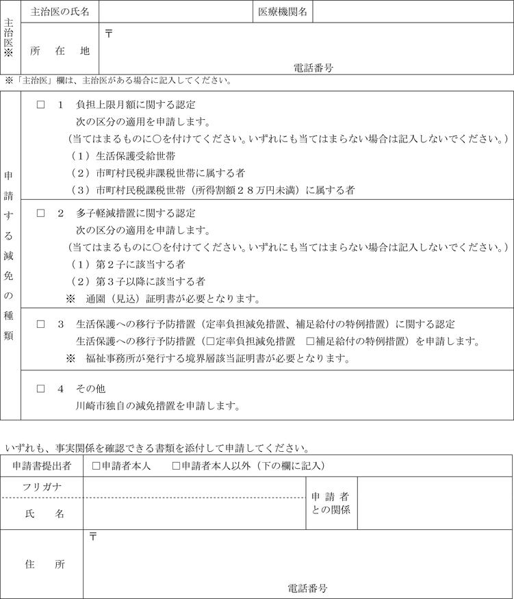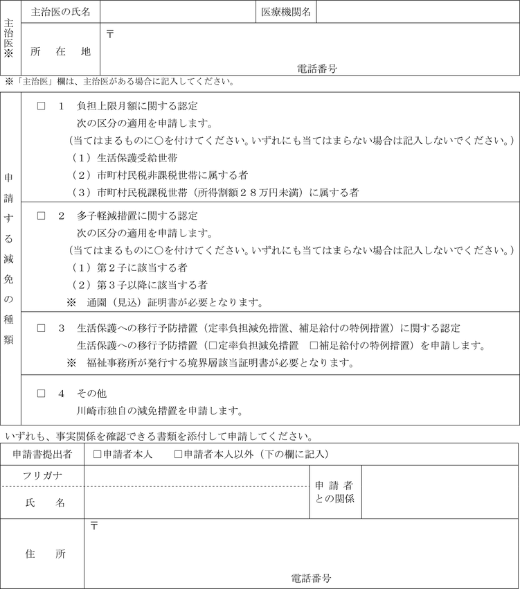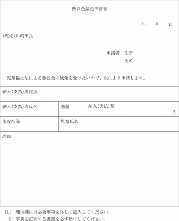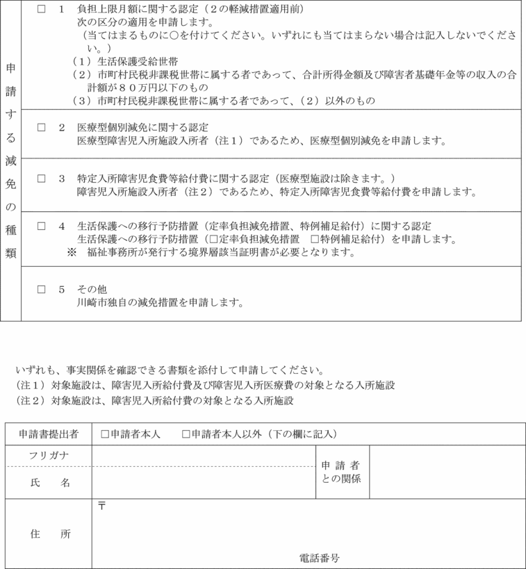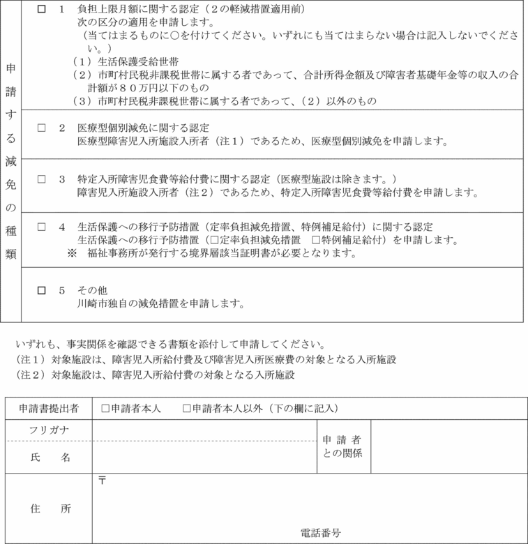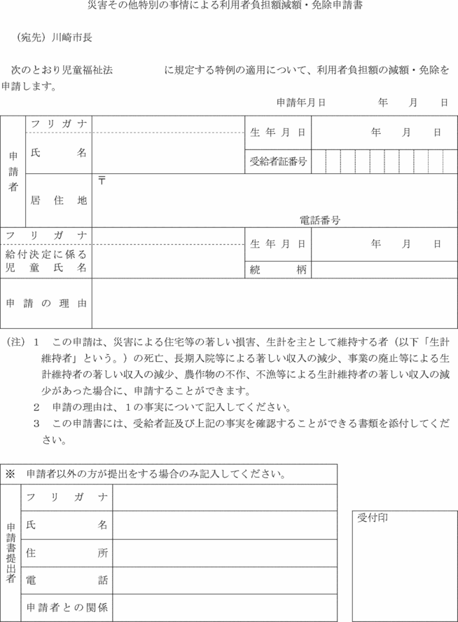 第7条の7 法第21条の5の11第1項に規定する障害児通所給付費の額の特例又は同条第2項に規定する特例障害児通所給付費の額の特例(以下この条において「障害児通所給付費等の額の特例」という。)の適用を受けようとする者は、災害その他特別の事情による利用者負担額減額・免除申請書(第15号の8様式)に命令第18条の25各号のいずれかに該当する旨を証する書類を添えて、市長に申請しなければならない。