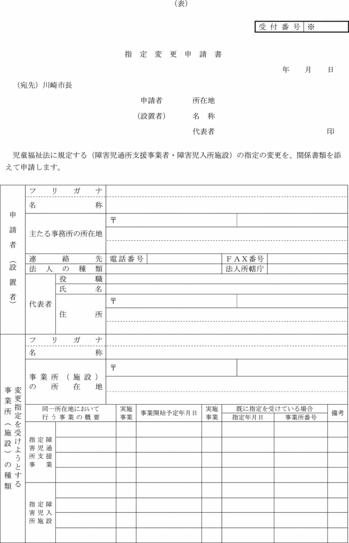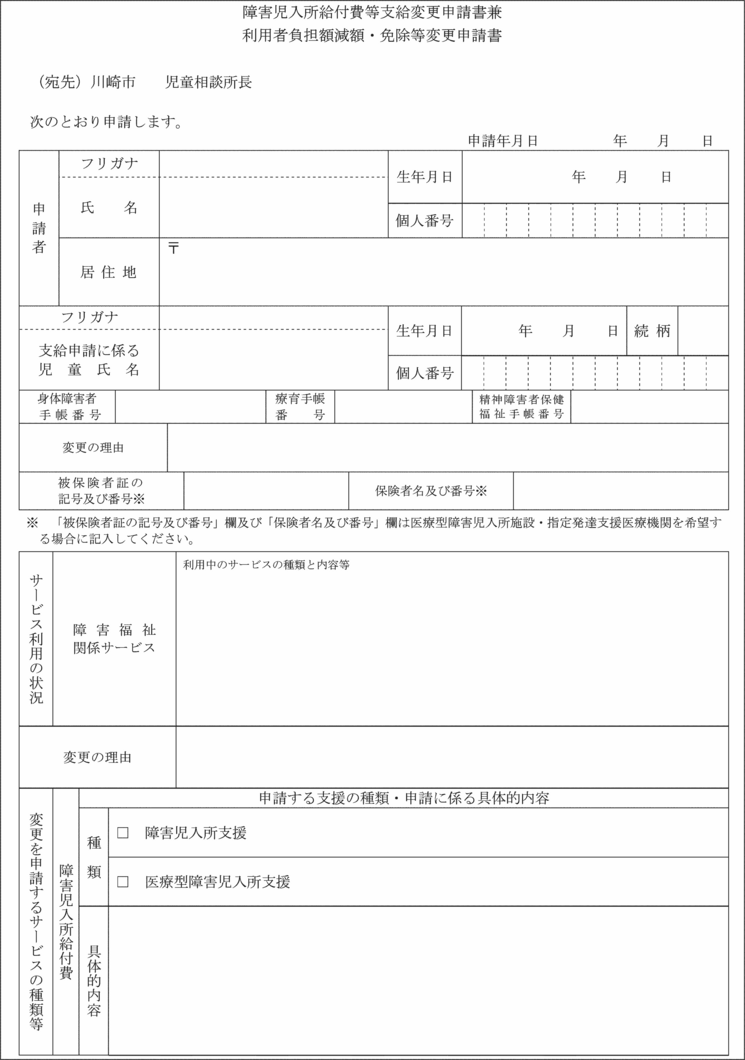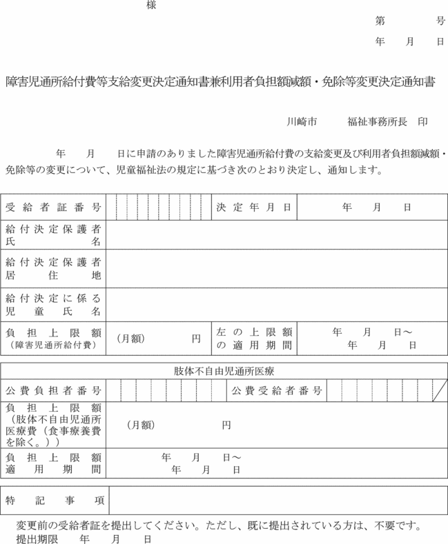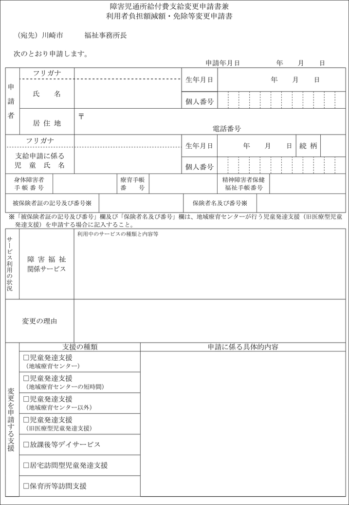 第7条の3 法第21条の5の8第1項の規定により通所給付決定の変更の申請をしようとする者は、障害児通所給付費支給変更申請書兼利用者負担額減額・免除等変更申請書(第15号の3様式)をその居住地を所管する福祉事務所長に提出しなければならない。