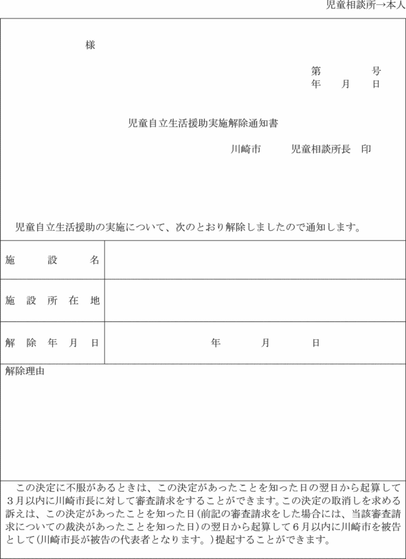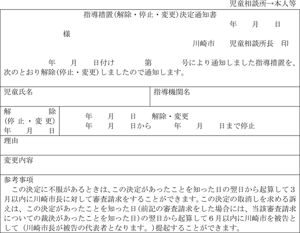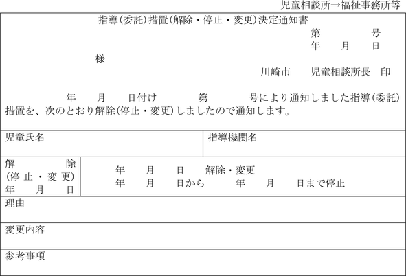 2 福祉事務所長は、前項の措置を解除し、停止し又は変更するときは、支援提供措置決定通知書により家庭支援事業を行う者及び本人等に通知しなければならない。