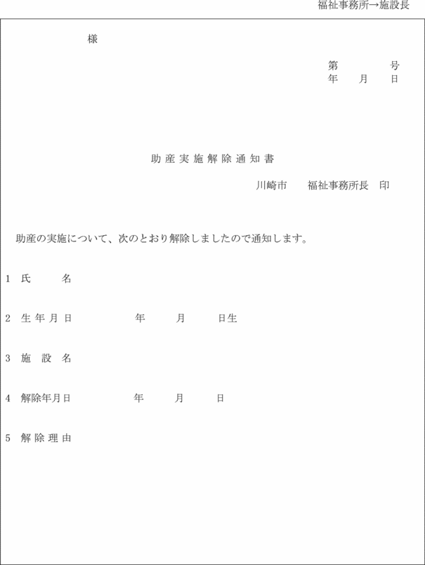 2 福祉事務所長は、前項の助産の実施を解除するときは、助産実施解除通知書(第19号の3様式)により助産施設の長及び妊産婦に通知しなければならない。