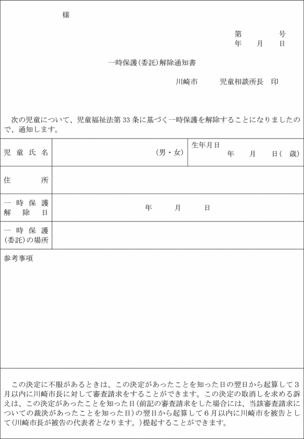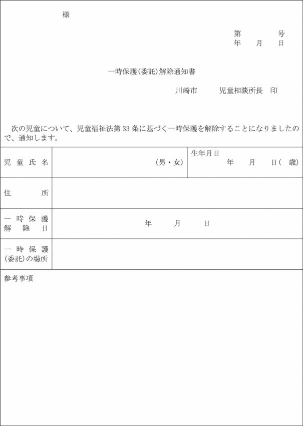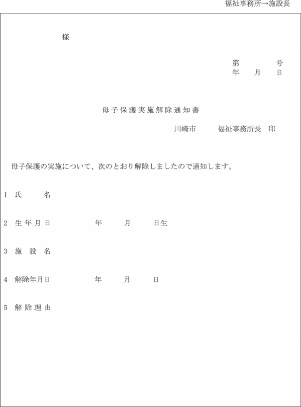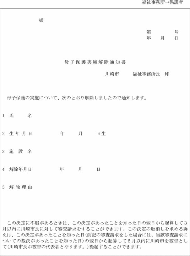 4 福祉事務所長は、母子保護の実施を解除するときは、母子保護実施解除通知書(第19号の6様式)により母子生活支援施設の長及び保護者に通知しなければならない。