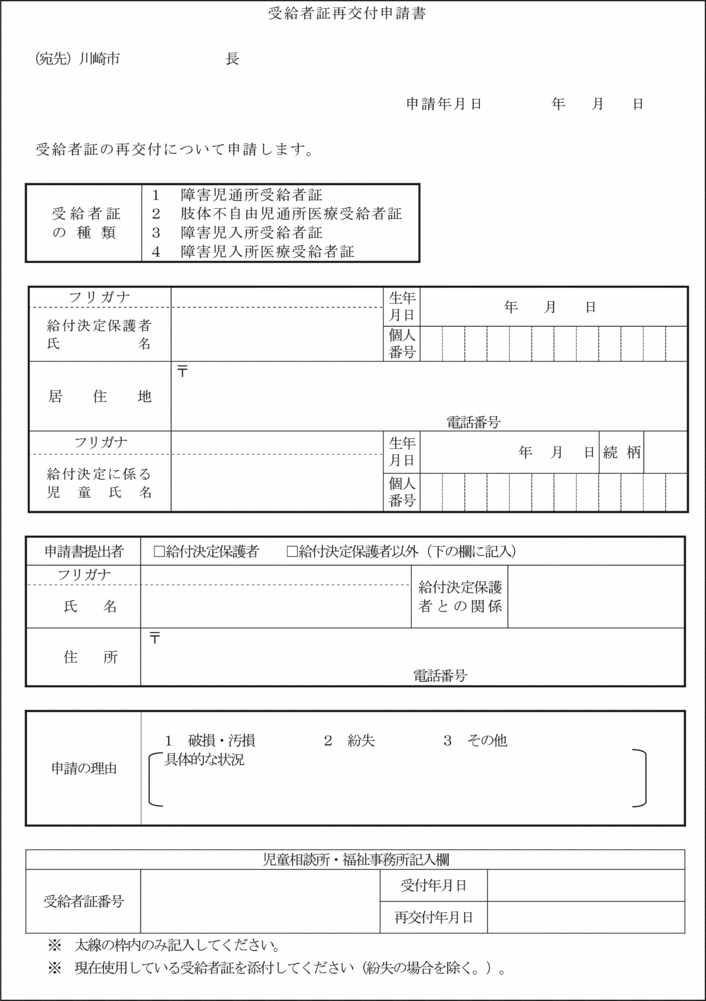 第9条の6 命令第25条の7第9項の規定により障害児入所受給者証の再交付の申請をしようとする者は、受給者証再交付申請書をその居住地を所管する児童相談所長に提出しなければならない。